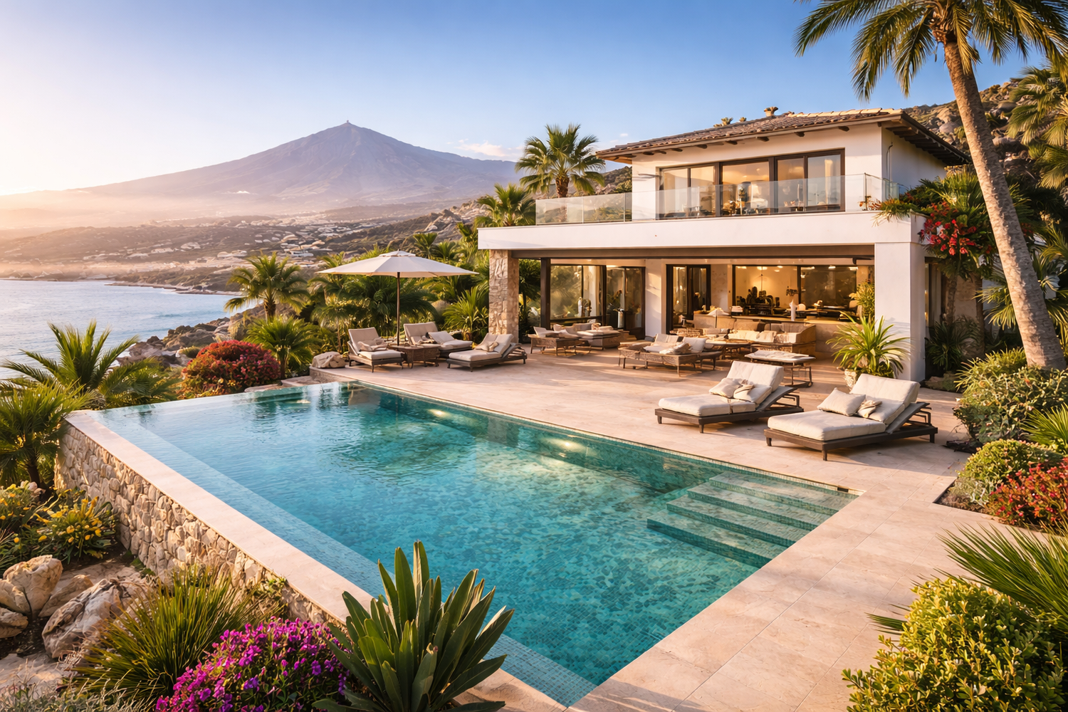 Auf Teneriffa spielt sich das Leben oft draußen ab: Lounge- und Essbereich im Freien, Grillzone, Sonnenterrasse und je nach Objekt Pool oder Jacuzzi. Viele Villen bieten Meerblick, Blick auf die Berge oder – in besonderen Lagen – sogar Sicht auf den Teide. Mediterrane und kanarische Bepflanzung (Palmen, Bougainvillea, Sukkulenten) sorgt für ein ruhiges, hochwertiges Ambiente.