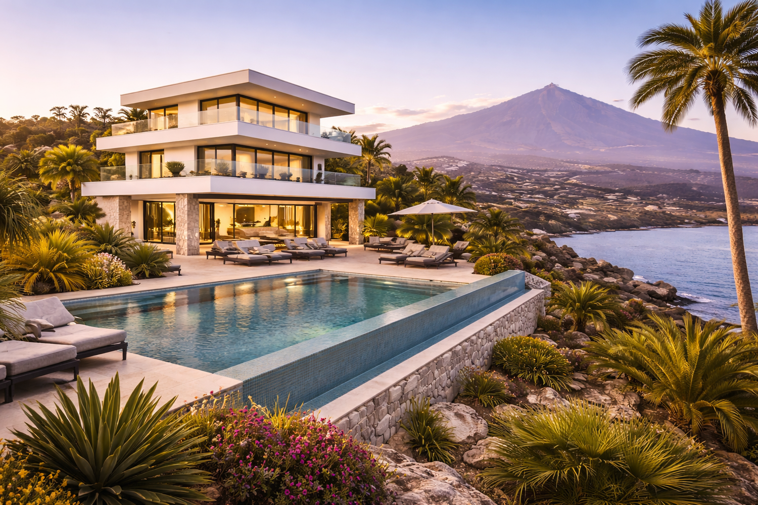 Eine typische Neubau-Villa im Luxussegment auf Teneriffa verbindet modernes Design, erstklassige Bauqualität und spektakuläre Insellage zu einem Wohnkonzept, das sich wie ein privates Resort anfühlt. Viele Premium-Projekte entstehen in bevorzugten Küsten- und Hanglagen – häufig mit Atlantikblick, Sonnenuntergängen und, je nach Ausrichtung, Sicht auf den Teide. Die Architektur ist dabei konsequent auf Licht, Weite und ganzjähriges Outdoor-Living ausgelegt.